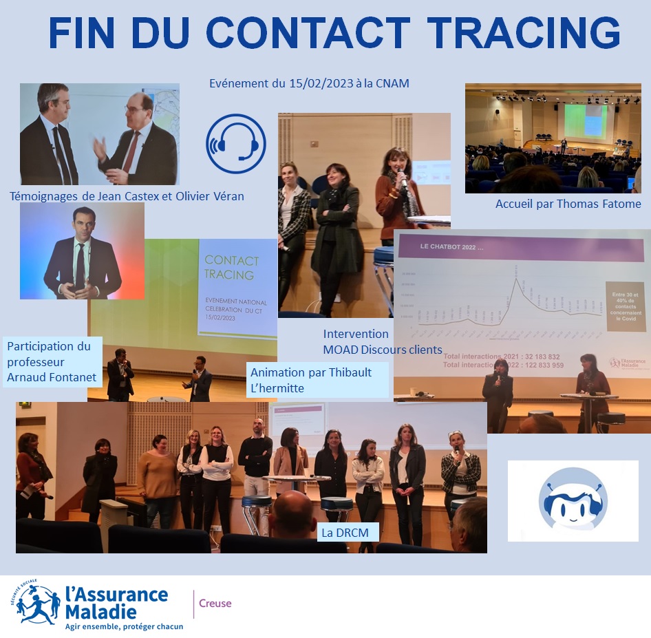 Après presque 3 années d'existence, le contact tracing a tiré définitivement sa révérence le 1er février 2023. Le décret n°2023-37 du 27/01/2023 a en effet mis un terme au dispositif mais également aux arrêts dérogatoires et au système d'information qui alimentait des bases de l'Assurance Maladie pour lui permettre de contacter les patients "zéro" et les "cas contact". La CPAM de la Creuse, en qualité de Maîtrise d’Ouvrage Déléguée Discours Client fait partie des acteurs majeurs conviés à la caisse nationale pour marquer la fin de cette aventure inédite