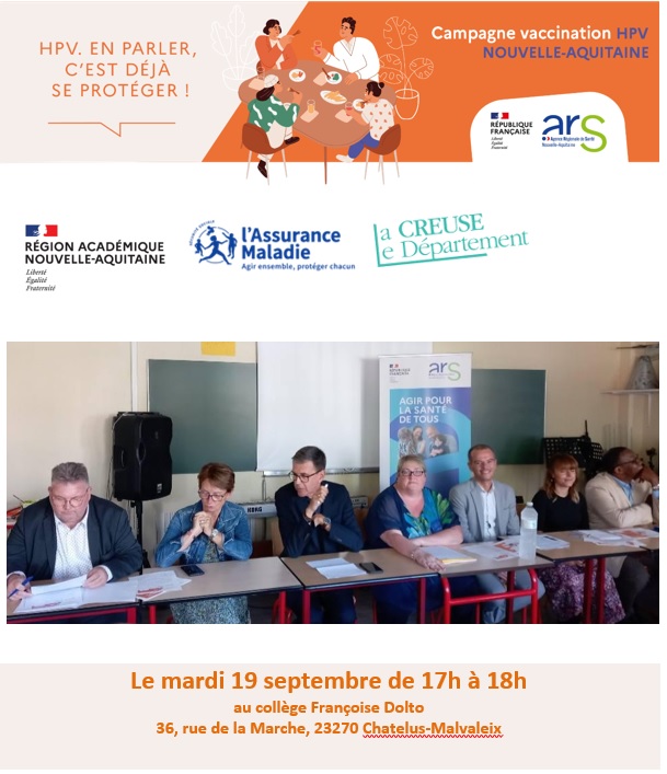 Pour faire suite à des expérimentations menées dans certaines régions, la rentrée scolaire 2023-2024 a été marquée par la généralisation de la vaccination contre les HPV dans tous les collèges publics et les collèges privés volontaires pour améliorer la couverture vaccinale des jeunes. Aussi la CPAM a répondu présent au lancement de cette campagne aux côtés de l’ARS et des acteurs du territoire au sein du collège Françoise Dolto à Chatelus-Malavaleix. En Creuse, au 31/12/2023, le taux de vaccination (1ère phase) était de 17% (20% pour la Nouvelle-Aquitaine).