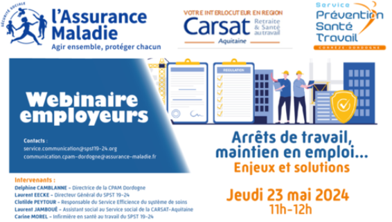 La CPAM de la Dordogne, en collaboration avec le Service de Prévention et de Santé au Travail Dordogne-Corrèze et le service social de la CARSAT Aquitaine a organisé deux webinaires spécialement dédiés aux employeurs et aux travailleurs indépendants.