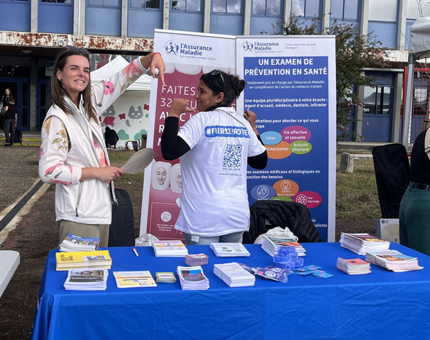 Sur l'esplanade du Campus de Périgueux, ambassadrices et ambassadeurs en prévention et e-santé ont tenu le stand de l'Assurance Maladie.